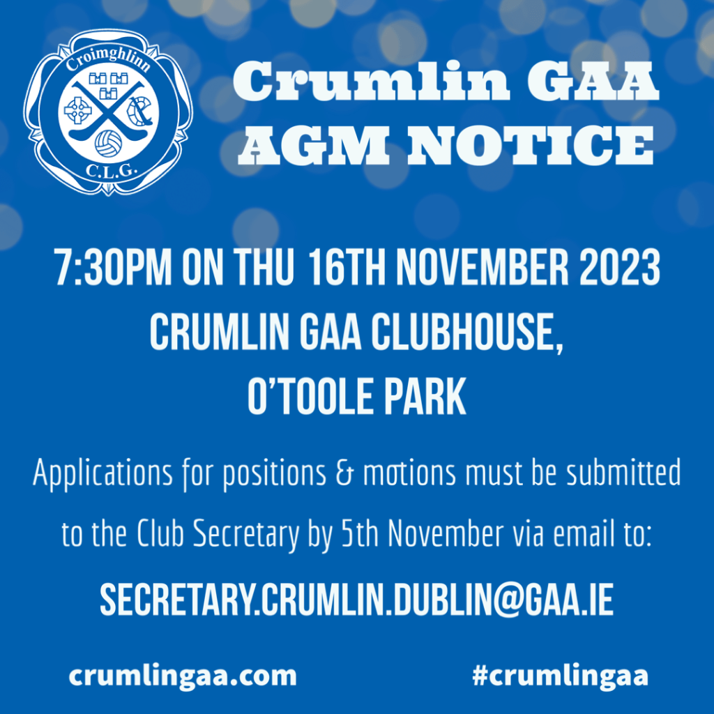 Applications for positions & motions must be submitted to the Club Secretary by 5th November via email to: secretary.crumlin.dublin@gaa.ie