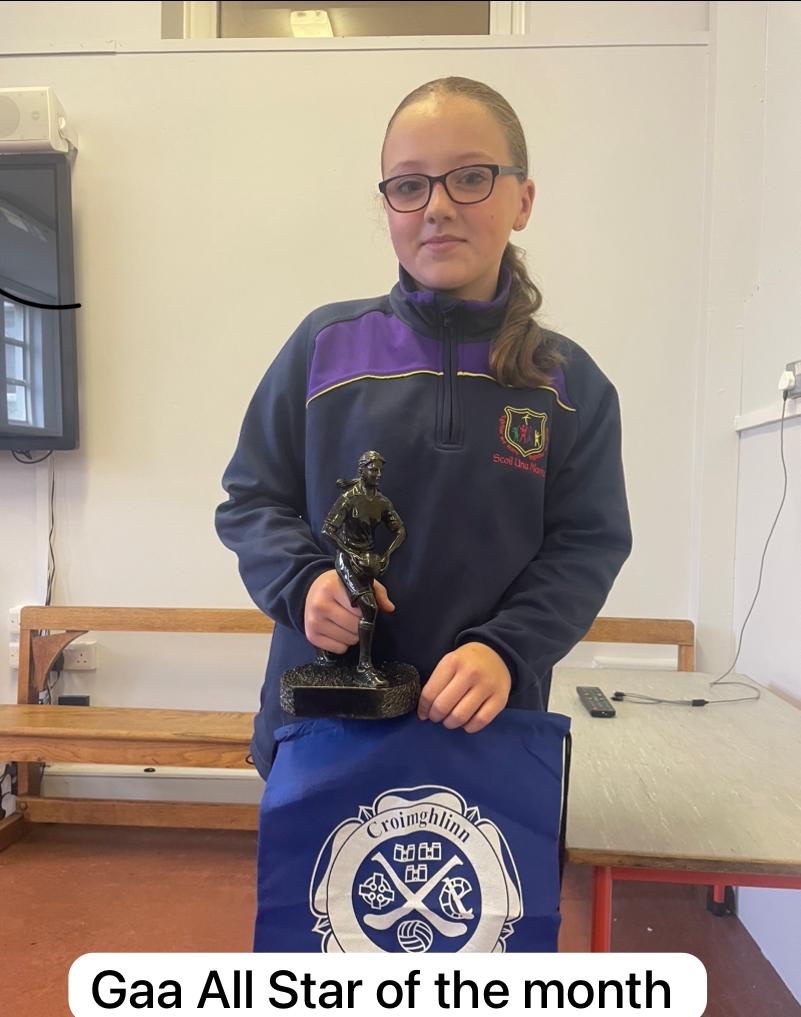 A big well done to Hannah Dolan who was presented with an award for GAA ALL STAR OF THE MONTH by her school.
