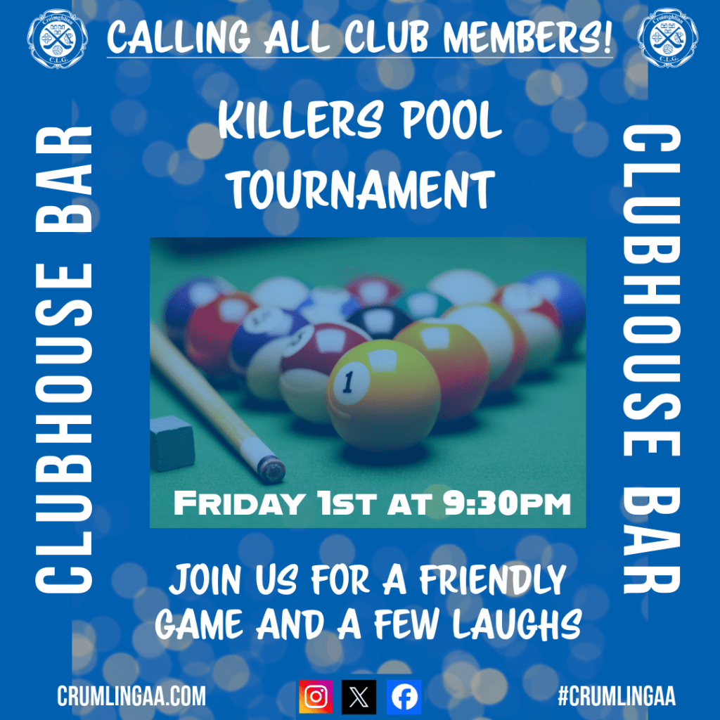 Monthly Killers Pool Tournament News Club Members Killers Pool Tournament this Friday 1st in the Clubhouse Bar. We’ll be starting at a later time of 9:30pm this month due to a training workshop. Come along for a friendly game and some guaranteed laughs! #crumlingaa Share this: Click to share on Facebook (Opens in new window) Facebook Click to share on X (Opens in new window) X Click to share on WhatsApp (Opens in new window) WhatsApp Click to share on LinkedIn (Opens in new window) LinkedIn Click to share on Pinterest (Opens in new window) Pinterest Click to email a link to a friend (Opens in new window) Email