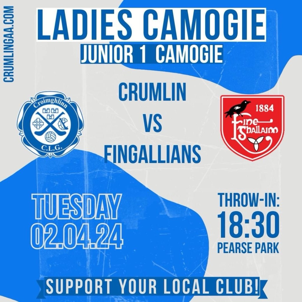Ladies Camogie vs Fingallians in Pearse Park in their first league game of the season. Match throws in at 6:30pm. We’d love to see you there.