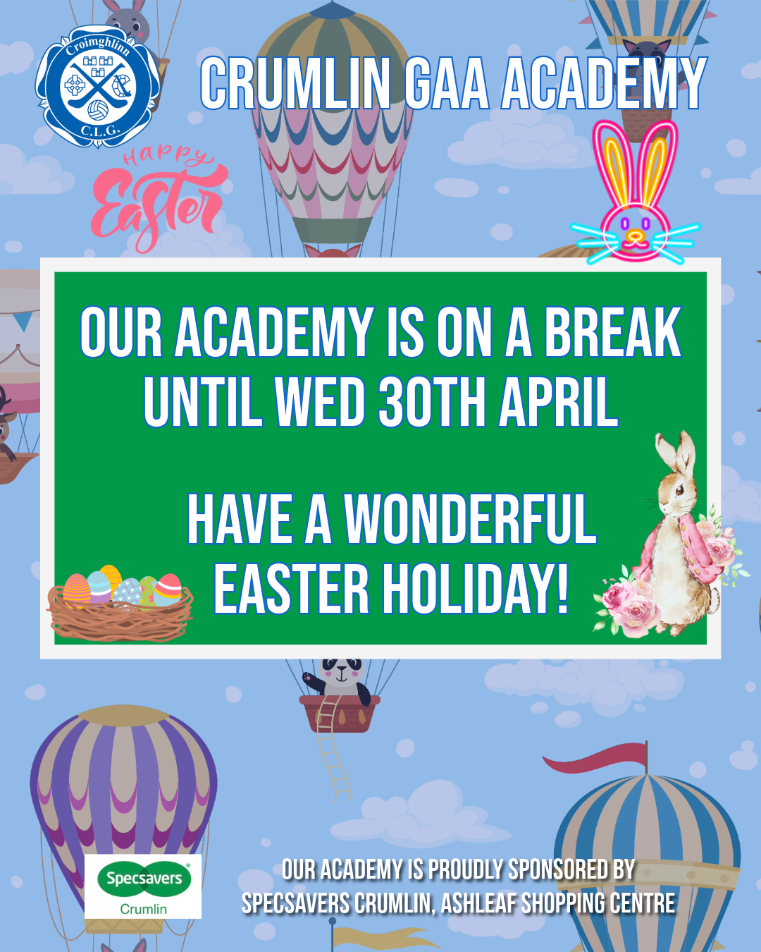 Academy on Easter Break News Our Academy will take a short break for the Easter holidays and will return on Wed April 30th. We wish all our academy members and their families a very happy Easter! Your Club. Your Community. Your Crumlin. #crumlingaa #crumlin #gaa #lgfa #camogie #clubisfamily Share this: Click to share on Facebook (Opens in new window) Facebook Click to share on X (Opens in new window) X Click to share on WhatsApp (Opens in new window) WhatsApp Click to share on LinkedIn (Opens in new window) LinkedIn Click to share on Pinterest (Opens in new window) Pinterest Click to email a link to a friend (Opens in new window) Email